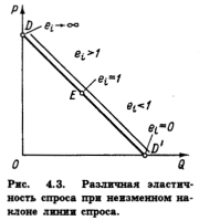 (или эла Ed p = DQd %/Dр% = (DQd /Dр)×(р/Qd ) – коэффициент точечной эластичности. Дуговая эластичность спроса характеризует относительное изменение объема спроса при значительном изменении цены. Ed p = (DQd /Dр) × ((р1 + р2 )/(Qd 1 + Qd 2 )) - коэффициент дуговой эластичности. Ценовая эластичность спроса зависит от наклона кривой спроса и фактических значений Р и Qd. Эластичность можно выразить как производную функции спроса и соотношение фактических значений цены и спроса. Это означает, что коэффициент эластичности будет различным в разных точках такой кривой, несмотря на один и тот же ее наклон. Графически коэффициент точечной эластичности линейной кривой спроса определяется соотношением отрезков кривой, лежащих выше и ниже интересующей нас точки. При более высоких ценах спрос более эластичен, при низких ценах спрос менее эластичен.
