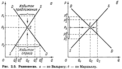 = Вернется ли рынок с течением времени к первоначальному состоянию равновесия в точке Е и примет ли цена первоначальное равновесное значение Р' , или этого не произойдет? Эта проблема носит название проблемы устойчивости (стабильности) равновесия . Это не просто теоретическая проблема, а практическая, т.к. возникает вопрос о необходимости государственного вмешательства. Если цена возвращается к первоначальному равновесному значению, то такое равновесие является устойчивым . Если цена стремится к первоначальному значению, никогда не достигая его, то такое равновесие называется асимптотически или условно устойчивым равновесием . Механизм установления рыночного равновесия по Л.Вальрасу и А.Маршаллу.