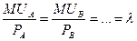 Математически предельная полезность товара есть частная производная общей полезности товарного набора (3.1) по объему потребления г-того товара: Соотношение между TU и MU означает, что первая производная функции общей полезности по количеству данного блага положительна, а вторая отрицательна: Наш следующий шаг заключается в том, чтобы связать общую и предельную полезность с поведением потребителя. Для этого сформулируем цель, к которой стремится рациональный потребитель, или, иными словами, критерий рациональности его поведения: потребитель стремится к достижению максимума общей полезности . Потребитель достигнет максимума удовлетворения, если он распределит свои средства на покупку различных товаров таким образом, что: для всех реально покупаемых им товаров А, В, С ,... имеет место