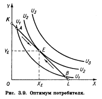 Равновесие потребителя . Потребитель стремится максимизировать получаемую им полезность, т.е. выбирает наиболее предпочтительный для себя набор товаров из множества доступных ему наборов. Графически предпочтения потребителя описываются кривыми безразличия, а доступность наборов благ – БЛ. Условия максимизации полезности: 1. функция общей полезности должна быть максимизирована 2. доход должен быть полностью реализован Совместим теперь карту безразличия нашего потребителя с его бюджетной линией KL .