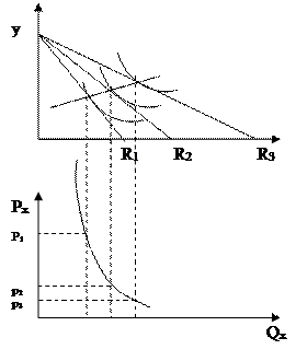 3. Кривые «цена-потребление» и «доход-потребление». Кривая « цена-потребление» - показывает множество всех оптимальных комбинаций товаров X и Y при изменении цены товара X и неизменной цене другого товара и постоянном доходе. На основе кривой цена-потребление можно построить линию индивидуального спроса. Кривая «доход-потребление» . - показывает множество всех оптимальных наборов или комбинаций товаров при изменении дохода потребителя и неизменном соотношении цен.