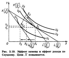 D 3. Эффекты дохода и замещения по Слуцкому и Хиксу. Компенсированный спрос Изменение цены какого-либо товара влияет на объем спроса через эффект замены и эффект дохода. Эффект дохода возникает, поскольку изменение цены данного товара увеличивает (при снижении цены) или уменьшает (при повышении цены) реальный доход, или покупательную способность, потребителя при неизменности относительных цен товаров. XI = X1 (P1 / ,I) – X1 (P1 / ,I/ ) XI – изменение количества товара Х вследствие ЭД X1 (P1 / ,I) – потребление товара Х при новой цене и старом доходе X1 (P1 / ,I/ ) – потребление товара Х при новой цене и новом доходе. Эффект замены возникает в результате относительного изменения цен при неизменном реальном доходе, т.е. при сохранении уровня полезности потребляемого набора благ. Х S = X1 (P1 / ,I/ ) - X1 (P1 ,I) ХS – изменение количества товара Х вследствие ЭЗ X1 (P1 / ,I/ ) – потребление товара Х при новой цене и новом доходе. X1 (P1,I) – потребление товара Х при старой цене и старом доходе. Общее изменение объема спроса на некоторый товар, вызванное изменением цены этого товара, называется общим эффектом изменения цены и представляет собой, таким образом, сумму эффекта замены и эффекта дохода Х = XS + XI Существуют, однако, два подхода к определению реального дохода, связанные с именами английского экономиста Дж. Хикса и русского математика и экономиста Е. Е.Слуцкого. Согласно Хиксу , разные уровни денежного дохода, обеспечивающие один и тот же уровень удовлетворения , т.е. позволяющие достигнуть одной и той же кривой безразличия, представляют одинаковый уровень реального дохода. Предложил считать неизменным реальный доход после изменения цены тот, который обеспечивает ПРЕЖНИЙ УРОВЕНЬ ПОЛЕЗНОСТИ. Согласно Слуцкому , лишь тот уровень денежного дохода, который достаточен для приобретения одного и того же набора или комбинации товаров , обеспечивает и неизменный уровень реального дохода. Предложил считать неизменным реальный доход после изменения цен при покупке ТОГО ЖЕ НАБОРА БЛАГ Подход Хикса в большей мере соответствует основным положениям порядковой теории полезности, тогда как подход Слуцкого имеет то преимущество, что позволяет дать количественное решение задачи на основе статистических материалов. Сначала мы рассмотрим версию, предложенную Хиксом, как более общую. Затем покажем особенности решения, предложенного Слуцким. Результат совместного воздействия ЭЗ и ЭД зависит от категории товара (нормальный товар, низший товар, товар Гиффена) ГРАФИЧЕСКИ разложение ЭЦ на ЭЗ и ЭД осуществляется с помощью дополнительной бюджетной линии и операции «поворот-сдвиг». Дополнительная бюджетной линии отражает изменение цены товара и сохранении прежней покупательной способности дохода. Поворот бюджетной линии означает изменение наклона бюджетной линии, т.е. при изменении цены одного из товаров. Поэтому поворот бюджетной линии определяет ЭЗ. Сдвиг бюджетной линии происходит при изменении реального дохода покупателя и неизменности цен на товары, следовательно, эта операция определяет ЭД.