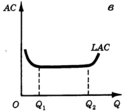 . Форма кривых средних затрат длительного периода различна в разных отраслях. В одних отраслях убывающая отдача от масштаба вступает в силу при "малых" объемах производства (рис. 8,а ), в других обширный диапазон объемов производства характеризуется возрастающей отдачей от масштаба и только при "очень больших" объемах выпуска отдача от масштаба начинает снижаться (рис. 8,б ). Разумеется, большими или малыми объемы выпуска являются относительно емкости рынка, т. е. спроса на продукцию отрасли. Многие отрасли характеризуются постоянной отдачей от масштаба производства в широких пределах изменения объема продукции, как на рис. 8,в .