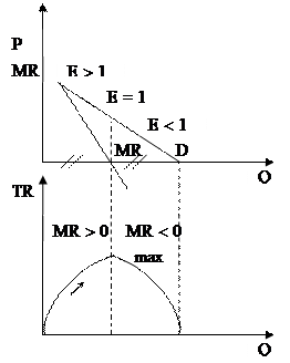 Существует взаимосвязь эластичности спроса по цене, общего дохода (TR) и предельного дохода монополии (MR). Когда спрос эластичен, значение MR положительны и общий доход растет. Когда спрос неэластичен, MR < 0 и ТR падает. Наконец, когда спрос единичной эластичности, MR = 0, а ТR – максимальный. Монополист, очевидно, ограничит объем выпуска эластичной частью кривой спроса.