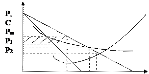 Рис. 7.3.1. Для определения монопольной прибыли необходимо знать соотношение цены (Рm ) и средних издержек (АТС). - Если Рm > АТС – монополист получает прибыль (p = (Р – АТС)×Q) и максимизирует ее; - Если AVC< Р <ATC – монополист несет убытки и, минимизируя их, продолжает производство; - Если Р = АТС – монополист полностью покрывает экономические издержки и имеет нулевую экономическую прибыль. В долгосрочном периоде монопольная фирма обеспечит равновесие в том случае, если сможет удержать контролируемую ею отрасль от проникновения в нее иных фирм. Используя входные барьеры чистая монополия способна получать экономическую прибыль и в долгосрочном периоде. Чистая монополия лишена кривой предложения, т.к. она сама назначает цену в соответствии с Qm . Решение монополиста об объеме выпуска (Qm ) невозможно отделить от кривой спроса. Концепция кривой предложения, как взаимооднозначного соответствия между ценами и объемами выпуска, в теории монополии, как и в теории рынков несовершенной конкуренции в целом, не используется. Говорят, что монополия не имеет кривой предложения . Для анализа поведения монополиста, как и других несовершенно конкурентных предприятий, решающее значение имеет соотношение спроса и затрат , МОНОПОЛИЯ В ДЛИТЕЛЬНОМ ПЕРИОДЕ Монополист действует на рынке в отсутствие соперников. Поэтому монополист может получать положительную экономическую прибыль и в длительном периоде, производя и продавая такой объем продукции, который соответствует равенству предельной выручки и предельных затрат длительного периода. В условиях появления конкурентов монополия может выбрать модель защиты. Фирма может установить очень высокую цену и обеспечить краткосрочную высокую экономическую прибыль, пока цена не упадет. Также фирма может выбрать политику «лимитирующего ценообразования», которая заключается в следующем: устанавливается цена на более низком уровне, позволяющем получать умеренную прибыль, и отрасль становится непривлекательной для возможных конкурентов. Установление такой цены требует низких затрат производства, которые не всегда могут обеспечить конкуренты. 2. Ценовая дискриминация при монополии. Экономические последствия монополии. Естественная монополия. В некоторых ситуациях чистая монополия может осуществлять ценовую дискриминацию – устанавливать разные цены на одинаковые по качеству и уровню издержек товары для разных покупателей. Условия осуществления ценовой дискриминации: 1) невозможность для потребителя перепродать купленный у монополии товар; 2) возможность разделить всех потребителей данного товара на группы в соответствии с их готовностью заплатить. Если фирма знает, какую максимальную цену готов заплатить за товар каждый покупатель, то имеет место совершенная ценовая дискриминация (ценовая дискриминация I степени). Последствия ценовой дискриминации: 1) производится больший объем продукции; 2) увеличивается прибыль продавца за счет потребительского излишка; 3) возрастает благосостояние общества, т.к. товар становится доступным большему числу потребителей. Графический анализ ценовой дискриминации. (при условии, что МС – const).