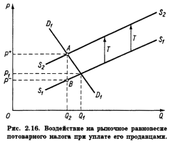 РАСПРЕДЕЛЕНИЕ НАЛОГА Налог одновременно влияет на цену спроса и цену предложения. Налог распределяется между покупателем и продавцом. Степень распределения зависит от наклона спроса и предложения, т.е. от эластичности кривых спроса и предложения. Чем больше наклон линии спроса и чем меньше наклон линии предложения, тем большая часть налога ложится на потребителей и тем меньшая часть налога ложится на производителей .
