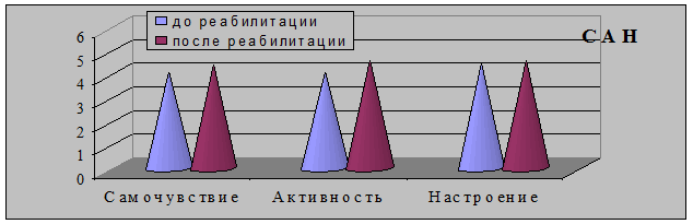 По результатам повторного обследования с помощью методики САН средние значения контрольной группы по всем шкалам методики САН находятся в пределах статистической нормы. Но нельзя говорить о благоприятном состоянии испытуемых, т. к. оценки свидетельствующие о благоприятном состоянии находятся в диапазоне от 5, 0 до 5,5 баллов. Таблица 2Результаты обследования испытуемых экспериментальной группы с помощью методики САН.