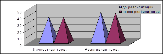 При сопоставлении полученных результатов обследования до реабилитации и после реабилитации у испытуемых контрольной группы не было обнаружено значимых изменений по шкалам «личностной» и «реактивной» тревожности (см. диаграмму 3) Диаграмма 4. Результаты теста (экспериментальная группа)