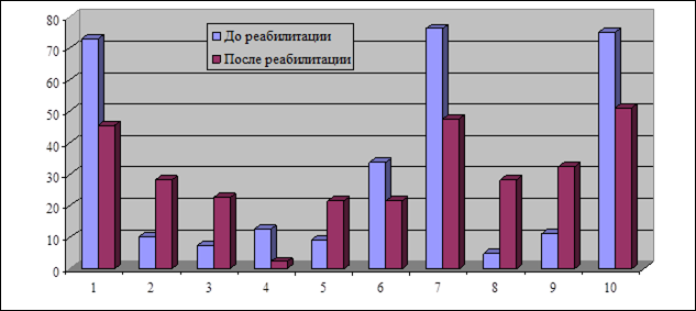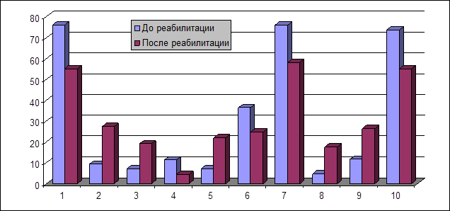 Анализ результатов исследования. Все особенности больных, которые наиболее часто прослеживались в их рисунках, представлены в диаграмме в виде средних параметров для их сравнения до и после реабилитации. Из диаграммы 7, контрольной группы средних значений видно, что больным наиболее свойственны такие психоэмоциональные особенности как тревожность, низкая самооценка и дизадаптация. Эти показатели ярко прослеживаются в диаграмме 7, в средних значениях (76%, 76%, 73,6% - соответственно) до реабилитации. И снижении этих показателей после реабилитации (средние: 55%, 58%, 55%). В свою очередь такие показатели как доверие с 7% до 19%; общительность с 7% до 22%; адаптация с до 11,6% до 26,3% возросли, что свидетельствует о положительном эффекте СПР. Диаграмма 8 . Результаты обследования с помощью графических методик (экспериментальная группа)