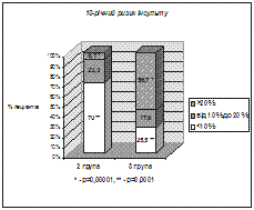 Рис. 3. Частота категорій 10-річного ризику важкої ІХС та ішемічного інсульту в групах пацієнтів з метаболічним синдромом Щодо маркерів системного запалення та гіперкоагуляції, то, хоч пацієнти 2 групи істотно не різнилися за їх концентраціями від 1 групи, але вони мали вірогідно частіше підвищений рівень фібриногену – в 38,4% випадків. Рівень СРБ >3 мг/л зустрічався в 54,6% хворих. У 21,2% випадків виявлялася гіперкоагуляція (за підвищеним рівнем РФМК), у 27,7% був позитивним етаноловий тест. Рівень D-димера не перевищував 120 мкг/л. Показники коагуляційного гемостазу були в межах норми в 43,1% хворих. У 52,7% пацієнтів 2 групи виявлено порушену геометрію ЛШ у вигляді концентричного ремоделювання (29,1%) та гіпертрофії (23,6%) (рис. 2). Високий і дуже високий 10-річний ризик (³10%) важкої ІХС визначено в 26,9% хворих, ішемічного інсульту – в 30,0% обстежених (рис. 3). 10-річний ризик ІХС суттєво вищий порівняно з 1 групою. У 3 групі підвищений ВЖТ зустрічався в 85,7% пацієнтів. У них виявлено вірогідно вищі показники ОТ/ОС та ТВЖ порівняно з 1 групою. Частота такої ознаки МС, як підвищена глюкоза натще і/або ЦД 2-го типу складала 48,8%. Істотно вищими (p<0,05) виявилися значення HOMA-IR(2,27 [1,45-3,36] од.) та концентрація глюкози натще (5,4 [4,9-7,2] ммоль/л), ніж у 1 групі (рівень глюкози 5,0 [4,9-5,4] ммоль/л), а також вищий рівень глюкози на 120-й хвилині ОГТТ (8,1 [6,3-8,8] ммоль/л) порівняно з 1 і 2 групами. Частота ІР досягала в них 76,5%. Хворі 3 групи відзначалися значущо нижчою активністю ПДГ (7,9 [2,7-8,1] мккат/л), ніж у 1 групі (16,2 [10,81-20] мккат/л, р<0,05) та 2 групі (12,2 [8,11-13,51] мккат/л, р<0,05). За більшістю показників ліпідного обміну хворі 3 групи не відрізнялися від пацієнтів 2 групи, частота підвищеного рівня ТГ становила 69%, а зниженого ХС-ЛПВГ – 40,5%. Але співвідношення ТГ/ХС-не-ЛПВГ виявилося значущо нижчим порівняно з таким у 2 групі (відповідно, 0,46 [0,31-0,66] та 0,55 [0,40-0,79], р<0,05). Використовуючи послідовний аналіз Вальда, було знайдено, що показник ТГ/ХС-не-ЛПВГ <0,40 є характерним для хворих з ІХС та ЦД та свідчить, очевидно, про підвищення концентрації апоВ-вмісних ліпопротеїнів. Частота гіпертригліцеридемії та високого рівня ЗХС складала в 3 групі, відповідно, 45,2% і 34,5%, що істотно вище, ніж у 1 групі. Гіперурикемію виявлено в 35,7% пацієнтів. Пацієнти 3 групи характеризувалися вірогідно вищою концентрацією СРП та частотою рівня СРП >3 мг/л (90,6%), вищими рівнями РФМК та етанолового тесту, порівняно з 1 та 2 групами. Значення фібриногену, РФМК та етанолового тесту залишалися в межах норми лише в 31,7% осіб (p=0,03 порівняно з 1 групою). Позитивний етаноловий тест зустрічався в 46,3% випадків – значущо частіше, ніж у 1 та 2 групах. Підвищений рівень РФМК знайдено в 35,4% хворих, така ж частота і гіперфібриногенемії. Концентрація D-димераперевищувала 120 мкг/л у 37,5% хворих, що значущо різниться з даними в 2 групі(p=0,02), де такі значення не виявлялися. У 79% хворих 3 групи виявлено зміни в геометрії ЛШ. Це була переважно гіпертрофія (в 62,8%) (рис. 2) та діастолічна дисфункція (в 85%). 10-річний ризик ішемічного інсульту в 3 групі був вищим порівняно з 2 групою. Високий або дуже високий ризик виявлено в 74,3% хворих, що значущо більше, ніж у 2 групі (30%, p=0,0001) (рис. 3). Отже, хворі з МС та ССХ/ЦД відрізняються від пацієнтів з МС, у яких не діагностовано цих хвороб, тим, що в них, поряд з більш вираженими вісцеральним ожирінням та порушеннями вуглеводного обміну, значно вищим виявляється атерот