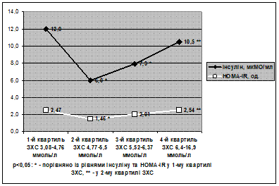 Для конкретизування патогенезу та опрацювання критеріїв діагностики МС було вивчено взаємозв’язки між його ознаками. Встановлено, що абдомінальне ожиріння є найвагомішою клінічною ознакою МС. Показники, що характеризують ожиріння, корелювали з ІР за HOMA-IR(рис. 4). Відповідно, майже з усіма показниками ожиріння (крім ВЖТ) була пов’язана й концентрація глюкози натще. Найбільш значущо корелювала ТВЖ з HOMA-IR. Це відповідає даним B.H. Goodpasteretal. (2005), за якими маса вісцеральної жирової тканини найбільше співвідноситься з ознаками МС. Встановлено, що ОТ та СДЖ тісніше корелюють з ІР, ніж ОТ/ОС (лише тенденція). Рівень ВЖТ також з великою ймовірністю позитивно корелював з HOMA-IR, відображаючи зв’язок ІР з усією масою жирової тканини в організмі та з відносним зниженням маси периферичних м’язів. Таким чином, доповнювати критерії МС можуть такі показними як СДЖ, ТВЖ та рівень ВЖТ.