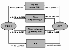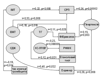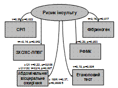 Рис. 7. Зв’язок структурно-функціональних показників серця з протромботичними та прозапальними маркерами, ожирінням і дисліпідемією Показники ІР – рівень інсуліну та HOMA-IRпозитивно корелюють з ознаками гіпертрофії ЛШ – масою ЛШ (відповідно, ф=0,20, p=0,016 та ф=0,19, p=0,022) та ІМЛШ (ф=0,22, p=0,041 та ф=0,15, p=0,063), що можна пояснити прямою дією на кардіоміоцити інсуліну як фактору росту або опосередковано – через стимуляцію симпатичної нервової системи (G. Grassi, 2006), посилення реабсорбції натрію нирками (A.P. Rocchinietal., 1989) тощо. Рівень ТГ не виявляє істотного зв’язку з ехокардіографічними даними. Але чітко простежуються обернені кореляції концентрації ХС-ЛПВГ з ІМЛШ (ф=-0,14, p=0,013) та діаметром ЛП (ф=-0,18, p=0,001), який, як відомо, збільшується при діастолічний дисфункції гіпертрофованого ЛШ. Систолічна функція ЛШ також погіршується із зниженням ХС-ЛПВГ (ф=0,14, p=0,014 між фракцією викиду та ХС-ЛПВГ). У літературі вказується на зв’язок гіпертрофії ЛШ та діастолічної дисфункції з рівнем ХС-ЛПВГ (G. Schillacietal., 2001; T. Horioetal., 2003; F. Ananetal., 2007). Пояснюють таку залежність тим, що ХС-ЛПВГ має превентивний вплив на розвиток гіпертрофії серця та діастолічної дисфункції через інгібіцію оксидації ХС-ЛПНГ та активацію синтезу оксиду азоту ендотелієм (J.-R. Nofer, 2004). Таким чином, розвиток гіпертрофії ЛШ та дилатації ЛП, а також дилатації ЛШ зі зниженням систолічної функції у пацієнтів з МС пов'язаний з АГ, ожирінням, ІР та зниженням ХС-ЛПВГ. Структурно-функціональна перебудова серця асоціюється при цьому з активацією системного запалення та коагуляційного гемостазу. Незалежними предикторами гіпертрофії ЛШ за даними багатофакторного аналізу нами визначено ІР (за HOMA-IR), знижений рівень ХС-ЛПВГ та підвищену концентрацію РФМК. У пацієнтів з МС маркери запалення і зсідання крові вірогідно позитивно корелюють між собою: рівень фібриногену та етанолового тесту, фібриногену та СРП, РФМК і етанолового тесту, СРП та D-димера. Це підтверджує зв’язок між запаленням і гіперкоагуляцією (M.-C. Tataruetal., 1999). В обстежених пацієнтів визначено 10-річний ризик гострих серцево-судинних ускладнень – важкої ІХС та ішемічного інсульту, а також вивчено зв’язки рівнів ризику з компонентами МС. Встановлено, що 10-річний ризик як ІХС, так і ішемічного інсульту тісно асоціюється, передусім, з активацією коагуляційного гемостазу та запалення, в основному з концентраціями СРП та РФМК (відсоток 10-річного ризику ішемічного інсульту корелює також з рівнем фібриногену) (рис. 8). Серед показників антропометрії з 10-річним ризиком як ІХС, так і інсульту позитивно пов’язувались ОТ, співвідношення ОТ/ОС та ТВЖ. Причому з найбільшою ймовірністю корелює з цим ризиком показник ОТ/ОС. Слід відзначити, що ризик гострих серцево-судинних ускладнень, за нашими даними, не пов’язаний з загальним ожирінням (за ІМТ та ВЖТ). Значуще позитивно корелює 10-річний ризик ІХС з ІР (за HOMA-IR) та концентрацією ТГ. Десятирічний ризик ішемічного інсульту обернено корелює з «атерогенним індексом» ЗХС/ХС-ЛПВГ. Хоча ризик інсульту істотно не пов’язаний з рівнями ЗХС та ХС-ЛПВГ, але їх співвідношення, яке відображає поєднання зниження ЗХС та зростання ХС-ЛПВГ, може служити маркером ризику ішемічного інсульту. В літературі знайдено дані про пряму асоціацію між підвищенням рівня ХС-ЛПВГ та ризиком інсульту, однак лише в жінок (M.L. Botsetal., 2002). P. Verdecchiaetal. (2004) дослідил