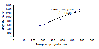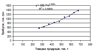 Рис.1.6 Експоненціальний графік Підставивши в рівняння регресії відповідні значення х, можна визначити теоретичні значення величини Ух для кожного показника Ух=1,9809х+13,56. Висновок За отриманими результатами можна зробити висновок, що зв’язок між обраними факторами досить значний, так як коефіцієнт апроксимації R2 в середньому дорівнює 0,97. Тобто зміна обсягів товарної продукції призведе до зміни прибутку підприємства. |