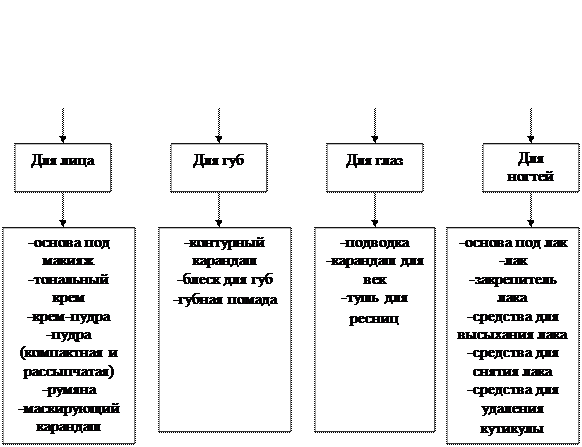 Декоративная косметика Характеристика ассортимента декоративной косметики Ассортимент декоративной косметики подразделяют в зависимости от целевого использования (назначения) на четыре группы: 1) средства для лица 2) средства для губ 3) средства для глаз 4) средства для ногтей. Декоративная косметика для лица Фон, на котором подчёркиваются глаза и губы, является основой всего макияжа. В зависимости от состояния и типа кожи могут возникнуть проблемы при использовании для макияжа пудры или тонального крема. Поэтому макияж начинают с подбора косметического средства, который носит название «основа под макияж» и применяется для того, чтобы: · сделать кожу лица гладкой, ровной, скрыть мелкие недостатки; · увлажнить кожу и создать условия для нанесения пудры, тонального крема, румян; · защитить кожу от неблагоприятных воздействий окружающей среды и декоративной косметики, содержащей красители. Ассортимент декоративной косметики Табл. 2