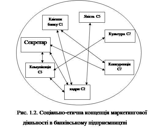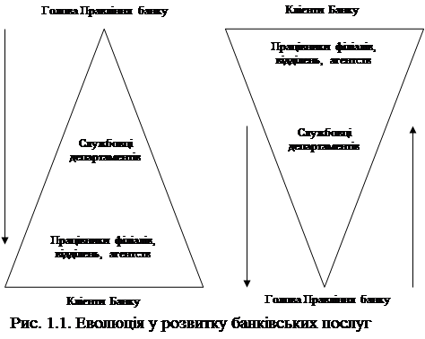Рис. 1.1 показує, що загальноприйнята структура банку до впровадження маркетингового підходу в його діяльність була пірамідою, в якій процес ухвалення рішень, позначений на схемі стрілкою, йшов зверху вниз (від голови правління банку до низових ланок ієрархічних сходів). Банк пропонував клієнтам ті операції й послуги, які вважав потрібним розробляти або виконувати, виходячи перш за все з власних можливостей і уявлень про перспективи розвитку, але ніяк не з інтересів клієнта. При цьому нерідко клієнт ставав жертвою помилок, припущених на різних рівнях піраміди. Клієнт був вимушений вибирати послугу з асортименту, що пропонувався йому. Саме так в даний час працюють українські банки. На початковому етапі впровадження банківського маркетингу банки нерідко використовують методи, прийоми маркетингу, не змінивши мислення. Таким чином маркетинг застосовується лише на нижніх рівнях піраміди. Проте на Заході в умовах жорсткої конкуренції та боротьбі за клієнта банки були вимушені змінити цей підхід. І тоді завданням керівника банка стає направити всю роботу на задоволення потреб клієнта. У новій організаційній структурі банку процес ухвалення рішень починається із з’ясування потреб клієнта, після чого визначаються можливості банку і формулюються пропозиції на кожному ступені ієрархічної структури. У правлінні банком під керівництвом голови правління ухвалюється рішення про створення нової послуги, припиненні надання старою і т.д. Після цього результати ухваленого рішення доводяться до всіх структурних підрозділів банку і, нарешті, виносяться на суд клієнта. Якщо пропонована клієнтові послуга чимось його не задовольняє, якщо банк істотно видозмінив пропозицію в порівнянні з первинним запитом клієнта, то останній просто не купить послугу, а звернеться в інший банк. Таким чином, в нових умовах політика банку орієнтована перш за все на задоволення потреб клієнта! При цьому дуже важливо, щоб кожен працівник банку вважав себе постачальником певної послуги, а не тільки службовці філіалів, що знаходяться в безпосередньому контакті з клієнтами. Таким чином концепція банківського маркетингу повинна бути інтегрована на всіх рівнях організаційної структури банку. Інтегрований маркетинг включає зовнішній маркетинг, направлений на клієнта, і внутрішній маркетинг, орієнтований на вдосконалення роботи служб і підрозділів банку, включаючи голову правління банку. 1.2 Концепція маркетингової діяльності в банківському підприємництві Концепція маркетингової діяльності – це орієнтована на споживача цільова філософія і стратегія банку. Вона ґрунтується на аналізі всього спектру показників що впливають на фінансово-кредитну систему в цілому й банка зокрема. На базі маркетингової концепції готуються пропозиції по оптимізації діяльності банку і в подальшому проводиться комплексне планування внутрішньої і зовнішньої діяльності банку. У банківському підприємництві можуть застосовуватися наступні концепції маркетингу: · Виробнича або концепція вдосконалення банківських технологій. Згодне їй клієнти при виборі банку орієнтуються на доступні послуги, що мають невисоку ціну. У зв’язку з цим банки, що дотримуються даної концепції, пропонують переважно традиційні послуги, що мають високу ефективність (прибутковість). Дану концепц