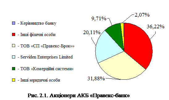 2.1.2 Статутний капітал банку та акціонери банку За станом на 01.01.2005 р. статутний капітал банку становить 108 960 000 гривень. Статутний капітал поділений на 107 460 000 штук простих іменних акцій та 1 500 000 штук іменних привілейованих акцій, номінальною вартістю 1 гривня кожна акція (Табл. 2.1, Рис. 2.1).