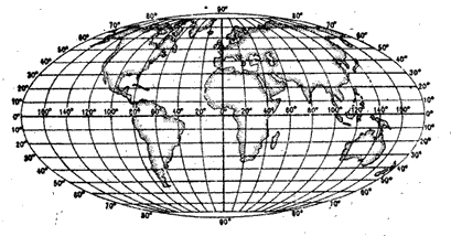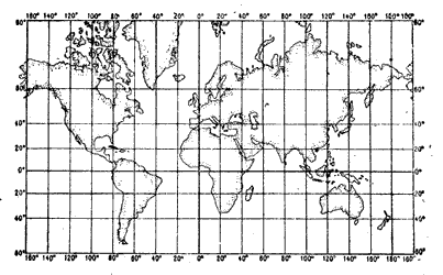 Рис.4 Карта мира в равноугольной проекции. - равновеликие, сохраняющие пропорциональность площадей на карте соответствующим площадям на земном эллипсоиде. На рис.5 показана карта мира, составленная в равновеликой проекции. На ней сохранена пропорциональность всех площадей, но искажено подобие фигур, то есть отсутствует равноугольность. Взаимная перпендикулярность меридианов и параллелей на такой карте сохраняется только по среднему меридиану.