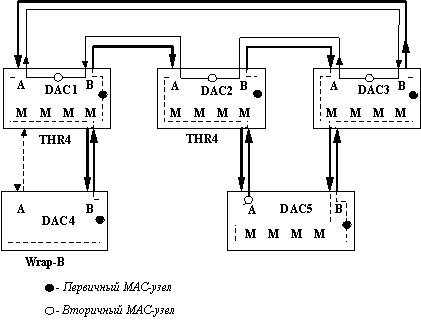 Рис. 2.6. Использование портов различных типов Соединение портов S - S является допустимым, так как создает изолированное первичное кольцо, соединяющее только две станции, но обычно неиспользуемым. Соединение портов M - M является запрещенным, а соединения A-A, B-B, A-S, S-A, B-S, S-B - нежелательными, так как создают неэффективные комбинации колец. Соединение Dual HomingСоединения типа A-M и B-M соответствуют случаю, так называемого, Dual Homing подключения , когда устройство с возможностью двойного подключения, то есть с портами A и B, использует их для двух подключений к первичному кольцу через порты M другого устройства. Такое подключение показано на рисунке 2.7. На нем два концентратора, DAC4 и DAC5, подключены к концентраторам DAC1, DAC2 и DAC3 по схеме Dual Homing. Концентраторы DAC1, DAC2 и DAC3 подключены обычным способом к обеим кольцам, образуя корневую магистраль сети FDDI. Обычно такие концентраторы называют в англоязычной литературе rooted concentrators . Концентраторы DAC4 и DAC5 подключены по древовидной схеме. Ее можно было бы образовать и с помощью концентраторов SAC4 и SAC5, которые бы в этом случае подключались бы к М-порту корневых концентраторов с помощью порта S. Подключение DAC-концентраторов по древовидной схеме, но с использованием Dual Homing, позволяет повысить отказоустойчивость сети, и сохранить преимущества древовидной многоуровневой структуры.