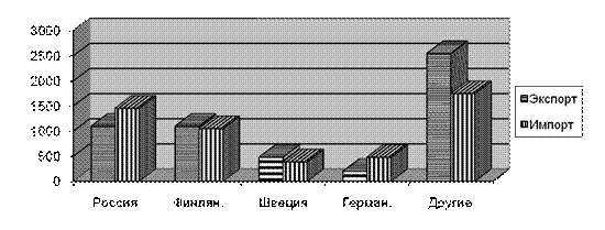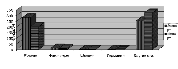 В 2001 году на долю России приходилось 56,5 % экспорта и 45,9 % импорта (график 1). Доля Финляндии была 2,3 % и 2 %.Вся экономика Эстонии была по-прежнему ориентирована на Восток.Ситуация коренным образом изменилась в 2002 году. В начале 2002 года отношения между Россией и Эстонией резко ухудшились. В результате в 2002 году были введены таможенные пошлины и квоты. Помимо этого в России была объявлена либерализация цен, что сделало неконкурентоспособными на эстонском рынке многие виды российских товаров. Введение в июле 2002 года своей национальной валюты в Эстонии тоже негативно сказалось на отношениях между Эстонией и Россией. Из-за этого возникли задержки платежей, неопределенность сроков поставок, и такой хаос в банковской системе привел к резкому уменьшению удельной доли России в эстонском внешнеторговом обороте, (см. график 2). График 2. Внешнеторговый оборот Эстонии по странам в 2002 г.