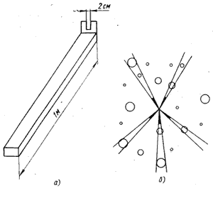 Рис. 43. Полнотомер Биттерлиха:а – схема прибора; б – принцип его работы Техника определения суммы площадей сечения сводится к следующему. Приложив свободный от насадки конец прибора к глазу и приняв какое-либо заметное дерево за начало отсчета, поворачиваются на 360°, визируя через насадку стволы окружающих деревьев на уровне груди (1,3 м). Площадь сечения каждого дерева, диаметр которого перекрывает прорезь насадки (угол визирования), принимают за 1 м2, точно закрывающий прорезь – за 0,5 м2. Остальные деревья учету не подлежат. Подсчитанная таким способом цифра и будет представлять собой сумму площадей сечения деревьев на 1 га. Густота насаждений - Плотность стояния деревьев и кустарников на участке защитного лесного насаждения, характеризующаяся их числом на единице площади (1 га) с учетом толщины стволов. Сомкнутость полога зависит от породы деревьев, их биологических особенностей, возраста, условий произрастания, лесорастительной зоны и др. При точных таксационных исследованиях необходимо отличать сомкнутостью, определяемую по площади проекции полога, от устанавливаемой по сумме площади проекции полога, от устанавливаемой по сумме площадей проекции крон. Сомкнутость представляет собой отношение площади проекции всего полога к площади участка, занимаемого насаждением. Она определяется как отношение суммы площадей проекции крон, учитываемых отдельно для каждого дерева, входящего в состав таксируемого насаждения, к площади, занимаемой этим насаждением. Сумма площадей проекции крон оказывается несколько больше площади проекции полога. Это объясняется тем, что кроны у смежных деревьев частично входят одна в другую и их проекции своими краями накладываются друг на друга. В результате при учете проекции крон деревьев часть площади проекции учитывается дважды. Если в сумме проекций крон прибавить площадь просветов между деревьями, получится величина, несколько большая площади, занятой таксируемым насаждением. Сомкнутость насаждения, определяемая по проекции полога, как правило, оказывается меньше единицы. Неизбежные просветы составляют 15-20% площади проекции полга полного насаждения. С увеличением числа деревьев на единице площади или, иными словами, с увеличением густоты насаждения сомкнутость полога увеличивается лишь до известного предела. При определенной густоте сомкнутость достигается максимума чего дальнейшее увеличение числа деревьев уже не приводит к увеличению сомкнутости полога. В старых лиственничных и сосновых лесах сибирской тайги на 1 га встречается 150-200 деревьев. Их кроны, как правило, не сомкнуты. Если в таких насаждениях поперечные сечения крон всех деревьев спроектировать на землю, полученная сумма проекции крон окажется меньше половины всей площади, занимаемой насаждением. При прочих равных условиях наибольшее смыкание хвойные насаждения имеют в возрасте от 20 до 80 лет, а порослевые насаждения лиственных пород – от 20 до 50 лет. При дальнейшем увеличении возраста насаждений сомкнутость постепенно уменьшается. Сомкнутость полога в северных и восточных лесах, растущих на бедных почвах, меньше, чем в средней и южной полосе. Полноту насаждений по сомкнутости крон устанавливают глазомерно. Таксатору чаще всего приходится работать в насаждениях, где между кронами соседних деревьев имеются значи