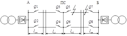 Рисунок 7 – Схема питания однопутного участка На двухпутном участке с постом секционирования выключатели работают, как правило, селективно. Объясняется это следующим, при к.з., например, в точке к1 (рисунок 8) через выключатель Q5 протекает ток к.з., почти в 3 раза больший, чем через любой подстанционный выключатель. Выключатели Q3, Q4, Q6 во внимание не принимаются, так как они поляризованные и на к.з. в точке к1 не реагируют. Уставка, выбранная для выключателя Q5 по условию (1.1), меньше, чем уставка для подстанционных выключателей Ql, Q2, Q7, Q8. Значит, разность между током фидера и уставкой для выключателя Q5 много больше, чем для любого другого выключателя и, следовательно, время его отключения будет существенно меньше, чем выключателей подстанций. Поэтому при к.з. в точке к1 сначала отключается выключатель Q5 и затем Q 7. Выключатели Q1 и Q2 отключиться не успеют. При к.з. в середине зоны между постом ПС и подстанцией В выключатели Q5 и Q7 отключаются практически одновременно.