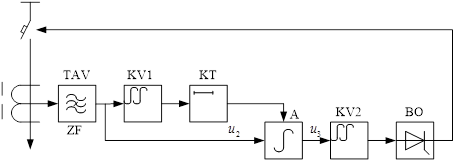 Рисунок 9 – Функциональная схема защиты реагирующей на приращение тока Функциональная схема содержит трансформатор TAV с воздушным зазором, режекторный фильтр ZF, пороговые элементы фиксированного времени КТ интегратор А и выходной орган ВО. Интегратор А имеет информационный вход, на который поступает напряжение На вторичной обмотке трансформатора TAV при этом образуются сигналы, которые после очищения в фильтре ZF от пульсаций интегратора А получает сигнал Если эта амплитуда превысит уставку порогового элемента KV2, то последний сработает и через выходной орган отключит выключатель Q. Уставка