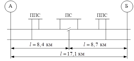 где х — время хода поезда по расчетной зоне, мин; — период графика (интервал попутного следования, принимаем 8 мин), мин; — длина расчетной зоны, км; v — средняя скорость движения, км/ч. Рассмотрим расчет межподстанционной зоны Яя – Ижморская. На границах межподстанционной зоны расположены тяговые подстанции ЭЧЭ-311 Яя и ЭЧЭ-312 Ижморская. В середине межподстанционной зоне расположены пост секционирования ПС Почитанка, так же установлены пункты параллельного соединения ППС расположенные на 3028 и 3037 км. Длина межподстанционной зоны составляет 17,1 км. На рисунке 11 представлена расчетная схема межподстанционной зоны.