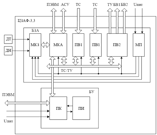 1.5.3 Устройство и работа устройства ЦЗАФ-3,3 1.5.3.1 Общие сведения об устройстве Устройство ЦЗАФ-3,3 состоит из двух основных частей: блока защиты и автоматики (БЗА) и блок управления (БУ). Между собой они соединены интерфейсным кабелем. Структурная схема устройства приведена на рисунке 14.