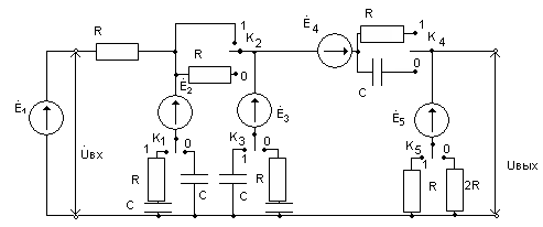 , а также напряжения на сопротивлении 4. Используя схему п. 3.1 рассчитать токи и напряжения на её элементах, используя формулы Крамера, а также обращение матриц. Осуществить сравнение результатов. 5. Для схемы из п. 3.3 найти выражение для комплексного коэффициента передачи электрической цепи. 6. Используя формулу для комплексного коэффициента передачи цепи определить выражение для АЧХ и ФЧХ цепи. 7. Построить, используя выражения из п. 3.6, графики для АЧХ и ФЧХ цепи. 8. Определить граничные частоты полосы пропускания и коэффициент прямоугольности цепи, используя результаты п. 3.7. 9. Дать характеристику исследуемой цепи по п. 3.3 с точки зрения фильтрации электрических колебаний. 2.Выбор варианта схемы Для выбора схемы необходимо представить свой номер по журналу студенческой группы в двоичной форме. Вариант №1 в двоичной форме равен 00001. Положение ключей в схеме: