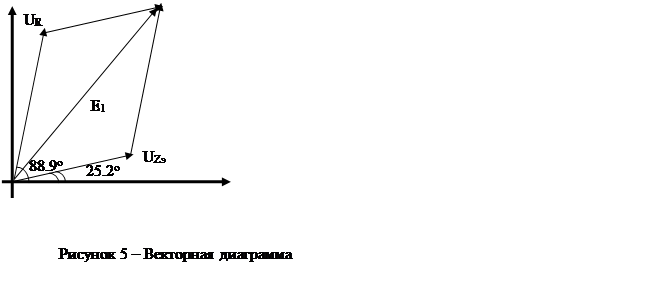 = zc = -jxc = -j*4501 [Ом] z1 = R+zc =420-j*4501 [Ом] z2 =z1 *(R+zc )/(z1 +R+zc )=210-j*2251 [Ом] z3 =z2 +R=630-j*2251 [Ом] z4 =z3 * zc /z3+ zc =324,877-j*1512 [Ом] zэ =z4 +R=744,877-j*1512 [Ом] İ=E1 /zэ = 1.531*10-4 +j*8.542*10-3 [A] |İ|= 8,543*10-3 [A] Im =|İ|*21/2 = 0,012 [A] i(t)= 0,012*cos(427040t+88,97) [A] UR =I*R=3,57*ej*88,97 [B] UZ э =I*Zэ =14,3*e j*25,2 [B] Построим векторную диаграмму: