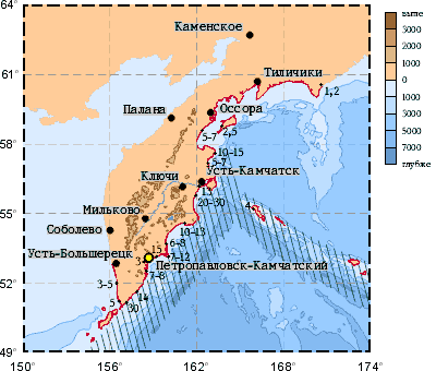 Первые сведения о цунами относятся к 17 октября 1737 года , а всего за последующие годы было отмечено 25 случаев цунами. Все они подходили к тихоокеанским берегам полуострова. У побережья Охотского моря цунами отмечено три раза, у беринговоморского - два раза. НАИБОЛЕЕ ИЗВЕСТНЫЕ СЛУЧАИ ЦУНАМИ 15 июня 1896 года в области Санрику (Япония) , которая охватывает три провинции, был местный праздник. На улицах находились тысячи людей. Во второй половине дня начали ощущаться подземные толчки. Многие жители, наученные горьким опытом, поспешили в горы, но через полчаса, успокоившись, поспешили на берег. Там они увидели, что море отошло от берега намного дальше, чем при обычном отливе. В 8 часов вечера послышалось могучее шипение и свист, как будто десятки поездов приближались на всех парах. Вскоре шипение перешло в грохот, и океан обрушился на берег шестью или семью волнами высотой около 35 м. Рыбаки, находившиеся в океане в районе эпицентра, не заметили цунами из-за малой амплитуды волн над глубоководьем. Но когда они вернулись в порт, перед их глазами предстала картина страшных разрушений. Целые деревни сравнялись с землей. Практически все прибрежные деревни и городки трех провинций, растянувшихся на 800 км, прекратили свое существование. В волнах цунами погибло более 27 000 человек. Эта катастрофа вошла в «Книгу рекордов Гиннеса» как одна из тяжелейших по числу жертв катастроф, связанных с цунами. 14 апреля 1923 года