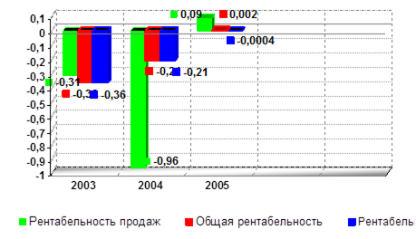 Рис. 8 Показатели рентабельности вложения (%) Рентабельность собственных средств также невысока, но в течении 2004 года она увеличилась с минус 0,15% до минус 0,0004%, хотя все ещё имеет отрицательный результат. Динамика этого показателя позволяет сделать вывод о том, что инвестиции собственных средств в производство дали недостаточно хороший результат. Рентабельность перманентного капитала и его динамика аналогичны рентабельности собственных средств, в виду отсутствия долгосрочных заёмных средств. В целом можно отметить, что все показатели рентабельности вложений предприятия находятся на низком уровне, что говорит о недостаточно эффективном вложении средств рассматриваемого предприятия. Вывод: Балансовая прибыль данного предприятия в 2005 году (+5 тыс. руб.) существенно увеличилась по сравнению с 2004 годом (-390 тыс. руб.) на 395 тыс. руб. Её увеличению способствовало: увеличение прибыли от финансово-хозяйственной деятельности, в основном за счёт статьи дохода «Проценты к получению» и увеличение выручки от реализации услуг. Снижению балансовой прибыли способствовало уменьшение доходов от внереализационных операций в сумме 1449 тыс. руб. Таким образом, факторы, уменьшающие балансовую прибыль, по сумме были перекрыты действием увеличивающих её факторов, что в итоге и позволило улучшить балансовую прибыль с минус 390 тыс. руб. в 2004г до + 5 тыс. руб. в 2005г. После уплаты налога на прибыль (в размере 6 тыс. руб.) с прибыли в сумме всего 5 тыс. руб. и уплаты штрафов и пени убыток Почтамта за 2005 год составил 106 тыс. руб. В целом все показатели прибыли и рентабельности в отчётном году возросли, что положительно характеризует деятельность Почтамта в 2005 году (относительно 2004 года). Факторный анализ рентабельности Для факторного анализа рентабельности используются 3 основные показатели рентабельности: 1. Анализ рентабельности производственной деятельности 2. Анализ рентабельности по каждому виду продукции 3. Анализ рентабельности продаж 1. Рассмотрим Анализ рентабельности производственной деятельности