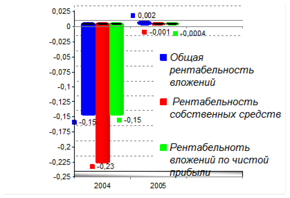 Общая рентабельность вложений в 2005г. увеличилась с минус 0,15% до 0,002% . Но на 1руб. стоимости имущества предприятия в отчётном году приходилось лишь 0,002 коп. балан совой прибыли. Значение данного показателя достаточно невелико для такого предприятия, что свидетельствует о недостаточно эффективном исполь зовании активов предприятия в 2004г-2005г.