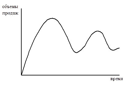 Рис.2 Кривая с «повторным циклом» Еще одной разновидностью является «гребешковая» кривая (рис.3), состоящая из последовательного ряда циклов, порожденных открытием новых характеристик товара, новых способов его использования, появлением новых пользователей. Объемы продаж