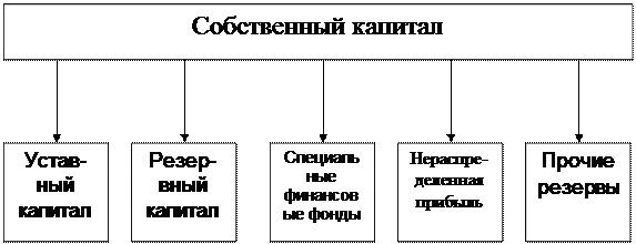 Рис.1 Формы функционирования собственного капитала предприятия. 1. Уставный капитал. Характеризует первоначальную сумму собственного капитала предприятия, инвестированную в формирование его активов для начала осуществления хозяйственной деятельности. Его размер определяется учредительными документами и уставом предприятия. Для предприятия отдельных сфер деятельности и организационно - правовых форм (акционерное общество, общество с ограниченной ответственностью) минимальный размер уставного капитала регулируется законодательством. 2. Резервный капитал. Представляет собой зарезервированную часть собственного капитала предприятия, предназначенную для внутреннего страхования его хозяйственной деятельности. Размер этой резервной части собственного капитала определяется учредительными документами. Формирование резервного капитала осуществляется за счет прибыли предприятия (минимальный размер отчислений прибыли в резервный фонд регулируется законодательством). 3. Специальные (целевые) финансовые фонды. К ним относятся целенаправленно сформированные фонды собственных финансовых средств с целью их последующего целевого расходования. В составе этих финансовых фондов обычно выделяют: амортизационный фонд, ремонтный фонд, фонд охраны труда, фонд развития производства и т.д. Порядок формирования и использования средств этих фондов регулируется уставом и другими учредительными документами предприятия. 4. Нераспределенная прибыль. Характеризует часть прибыли предприятия, полученную в предшествующем периоде и не использованную на потребление собственниками (акционерами, пайщиками) и персоналом. Эта часть прибыли предназначена для капитализации, т.е. для реинвестирования на развитие производства. По своему экономическому содержанию она является одной из форм резерва собственных финансовых средств предприятия, обеспечивающих его производственное развитие в предстоящем периоде. 5. Прочие формы собственного капитала. К ним относятся расчеты за имущество (при сдаче его в аренду), расчеты с участниками (по выплате им доходов в форме процентов или дивидендов) и некоторые другие, отражаемые в первом разделе пассива баланса. 1.2 Характеристика отдельных составляющих собственного капитала 1.2.1 Уставный капитал Уставный капитал является одним из важнейших показателей, позволяющих получить представление о размерах и финансовом состоянии экономических субъектов. Это один из наиболее устойчивых элементов собственного капитала организации, поскольку изменение его величины допускается в строго определенном порядке, установленном законодательно. Уставный капитал организации – источник формирования средств организации, который нужен ему для выполнения уставных обязательств. Это стартовый капитал для производственной деятельности с целью получения в дальнейшем прибыли. Уставный капитал представляет собой средства, вложенные собственниками предприятия. Собственниками предприятия могут выступать как юридические, так и физические лица, а также отдельные частные лица. Формирование уставного капитала связано с целями создания организации и ее организационно-правовой формой. Порядок формирования уставного капитала организаций разных организационно-правовых форм достаточно жестко в настоящее время регули