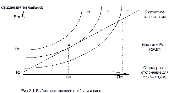 Обозначим удовлетворение вкладчика через кривые безразличия U1,U2,U3 таким образом, что U1 будет отображать максимальное удовлетворение, а U3 – минимальное. Кривые безразличия идут вверх, так как с ростом риска (Qp ) растет и ожидаемая прибыль (Rp ), которая компенсирует риск. Проведем бюджетное ограничение, показывающее взаимосвязь риска и прибыли: Rp = Rf + b(Rm - Rf ) = Rf + Rm – Rt /Qm ´ Qp (2.2.5.) Если инвестор, не желая рисковать, вкладывает все свои сбережения в государственные казначейские векселя, то b = 0 и Rp = Rf (см. рис. 2.1.). Если, наоборот, перед нами отчаянный любитель риска, который вкладывает все свои деньги в покупку ценных бумаг, то b =1, тогда Rp = Rm и при этом резко возрастет риск(см рис.2.1.). В действительности равновесие установится где-то между Rf и Rm (так как часть его средств будет вложена в акции, а часть – в казначейские векселя), например в Re при риске Qe ( в интервале от 0 до Qm )/ Эти точки Re и Qe являются проекцией пересечения кривой безраличия(которая характерна для данного индивида) с бюджетным ограничением в Е. Где именно на бюджетной прямой находится эта точка, зависит от отношения инвестора к риску.[13, 140-157]