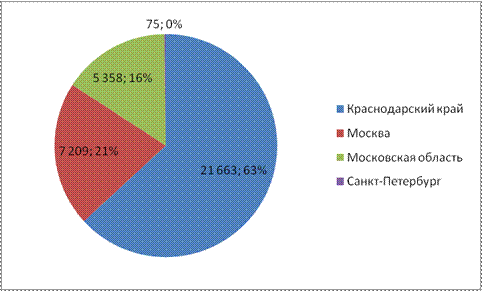 Лидирующим по производству кофе регионом в 2006 году стал Краснодарский край, где расположен завод компании «Нестле Россия». Рис.6.. Объемы и доли производства кофе в России в 2007 году по регионам (по данным ФСГС), т. и %