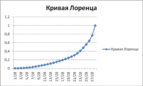 Индекс Герфендаля-Хиршмана.(HHI)Данный показатель основан на учете доли рынка, контролируемого фирмами, действующими на этом рынке. Он показывает степень монополизации рынка. В нашем случае HHI=0.099777668 , это говорит о невысокой монополизации рынка и о конкуренции между его участниками. Индекс концентрации (concentrationratio) Измеряется как сумма рыночных долей крупнейших фирм, действующих на рынке: Ck = Σ Yi, i =1, 2...k, где Yi - размер фирмы (например, рыночная доля); Так, исходя из таблицы , принимаю за крупную фирму, предприятие с долей на рынке выше 5 %. Из двадцати восьми предприятий, вошедших в таблицу, только шесть имеют необходимую долю на рынке. Тогда, Cr=0.23319+0.12525+0.08452+0.07637+0.07230+0.05804=0.649695. Шесть наиболее крупных компаний-производителей кофе составляют около 65% всей отрасли, что говорит и достаточно высокой концентрации. Для построения кривой концентрации и кривой Лоренца используем таблицы 8, 9.