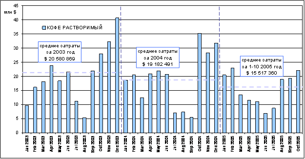 Производители кофе постоянно разрабатывают новые продукты и новые виды упаковки. На фоне растущей покупательной способности и увеличивающихся доходов населения, которые наблюдаются в течение последних лет, российские потребители становятся все более требовательными. Россияне готовы платить за качественный кофе в качественной красивой упаковке, поэтому производители ищут новые возможности для расширения своего ассортимента. Кроме того, компании вкладывают деньги в продвижение и рекламу новых брендов и разновидностей существующих марок. 4.3. Реклама Кофе стал неотъемлемым элементом стиля жизни значительной доли наших соотечественников – по данным исследований этот напиток пьют примерно 25% россиян несколько раз в день. Имидж растворимого кофе – динамизм, современность. Во многом такое восприятие сформировано рекламой. Например, можно вспомнить рекламные ролики кофейной марки Jacobs. Растворимый кофе, в первую очередь благодаря удобству и быстроте приготовления, продолжает пользоваться очень высоким спросом – его пьют более 90% россиян. Краткий анализ Сезонность рекламных инвестиций