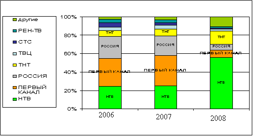 В 2004 году, по сравнению с 2003, объем рекламы на ТВ сократился на 7%. В 2005 году, по сравнению с аналогичным периодом (январь - октябрь) 2004 года, сократился на 9%. За исследуемый период 2003 – октябрь 2005 год на телевидении рекламировалось 25 марок растворимого кофе из 42 рекламируемых с помощью какого – либо медианосителя. Основные рекламодатели представлены в таблице Так как кофе потребляют во всех уголках нашей страны, то кофейные компании чаще всего используют размещение на национальных ТВ-каналах – НТВ, Первый канал, Россия (Рис. 17). Рис. 17. Распределение рекламных инвестиций марок кофе по ТВ-каналам
