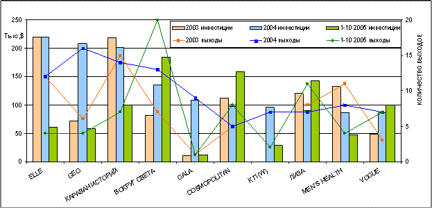 Распределение рекламных инвестиций (левая ось) и количества выходов (правая ось) рекламы между изданиями (топ - 10) за весь исследуемый период (поранжировано по инвестициям за 2004 год) Изменения позиций лидеров по годам можно проследить в таблице 12. Таблица 12.Распределение позиций лидеров по инвестициям в прессе по годам (топ–10)