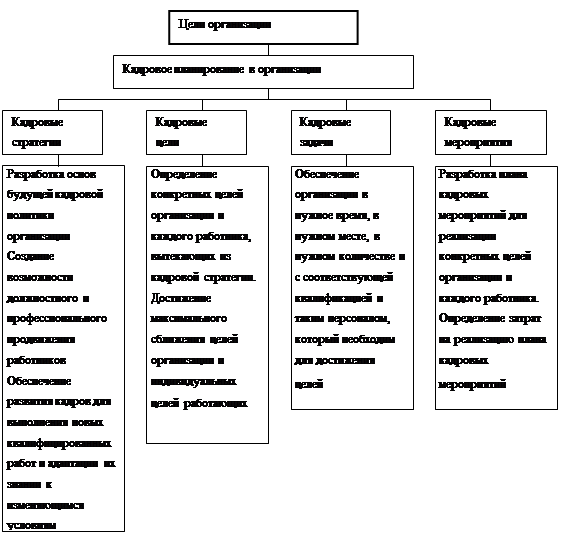 Рисунок 3 - Цели и задачи кадрового планирования в организации Анализ состояния персонала предприятия должен включать изучение функций, которые должны быть выполнены для достижения той или иной цели, а также оценку количества людей, необходимого для выполнения каждой функции. Кадровая политика формирует: требования к рабочей силе на стадии ее найма (к образованию, полу, возрасту, стажу, уровню специальной подготовки и т.п.); отношение к "капиталовложениям" в рабочую силу, к целенаправленному воздействию на развитие тех или иных сторон занятой рабочей силы; отношение к стабилизации коллектива (всего или определенной его части); отношение к характеру подготовки новых рабочих на предприятии, ее глубине и широте, а также к переподготовке кадров; отношение к внутризаводскому движению кадров и т.д. Кадровая служба предприятия - это совокупность специализированных структурных подразделений в сфере управления предприятием вместе с занятыми в них должностными лицами (руководители, специалисты, исполнители), призванными управлять персоналом в рамках избранной кадровой политики. Главное назначение кадровой службы состоит в том, чтобы не только руководствоваться в осуществлении кадровой политики интересами предприятия, но и действовать с учетом трудового законодательства, реализации социальных программ, принятых как на федеральном, так и на территориальном уровне. Необходимо отметить, что во многих капиталистических странах в последнее десятилетие серьезно просматриваются значение кадровых служб, их функции. Этот процесс особенно усиливается в условиях, когда у организации, работающей в нестабильной обстановке, накапливаются экономические трудности. Кадровые службы приобретают новые функции под воздействием таких факторов, как рыночные отношения, частная собственность, постоянная инфляция, быстро меняющееся законодательство, смена ценностных ориентаций людей. К функциям кадровой службы крупного и среднего предприятия относятся [10]: обеспечение кадрами: определение потребности в кадрах, поиск специалистов, заключение контрактов, ознакомление с рабочим местом и условиями труда, прекращение контрактов, перемещение кадров; подготовка, переподготовка и повышение квалификации кадров; оформление трудовых правоотношений; организация оплаты труда, подразумевающая аттестацию рабочих мест, определение структуры оплаты труда и структуры льгот, системы показателей труда, анализ рынка труда; выявление социальной напряженности и коллективе и снятие ее; развитие отношений с органами рабочего самоуправления; координация работы по стабилизации условий труда и соблюдению техники безопасности; обеспечение каждой службы организации квалифицированными кадрами. Как видим, функции службы управления персоналом достаточно многообразны и кадровая работа должна занимать достаточно много времени руководства. Поэтому на предприятиях необходимо создание специального подразделения по работе с персоналом. Речь идет о формировании на предприятии многофункциональной кадровой службы как единого целого, об организации (координации) всей работы структурных подразделений в системе управления производством, в той или иной мере занятых работой с людьми, под единым руководством. Лишь в этом случае возможно комплексное решение не толь
