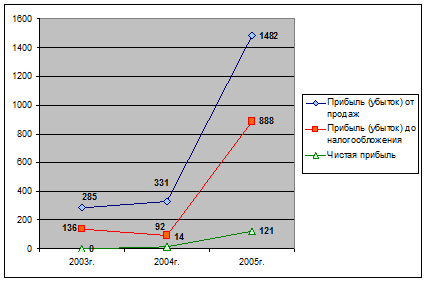 Рисунок 5 - Динамика изменения показателей прибыли ООО «СГ-Консалт» за 2003-2005 гг. Прибыль от реализации продукции и услуг увеличилась в 2004 году на 46 тыс. руб., в 2005 году – на 1151 тыс. руб. и составила 1482 тыс. руб. Увеличение объема реализации продукции и услуг организации произошло за счет увеличения цен, повышенного спроса на оказываемые консалтинговые услуги. Прибыль до налогообложения организации снизилась в 2004 году на 44 тыс. руб. и составила 92 тыс. руб., в 2005 году она увеличилась на 796 тыс. руб. и составила 888 тыс. руб. Чистая прибыль организации в 2004 году составила 14 тыс. руб., в 2005 году – 121 тыс. руб., что на 107 тыс. руб. больше уровня предыдущего года. Рост величины чистой прибыли предприятия в 2005 году объясняется высокими результатами деятельности организации, увеличением выручки и снижением соответствующей себестоимости. Также велики размеры поступивших операционных и внереализационных доходов организации. Система показателей финансовых результатов включает в себя не только абсолютные, но и относительные показатели эффективности хозяйствования. К ним относятся показатели рентабельности. Показатели рентабельности характеризуют эффективность работы предприятия в целом, доходность различных направлений деятельности. Они более полно, чем прибыль, характеризуют окончательные результаты хозяйствования, потому что их величина показывает соотношение эффекта с наличными или использованными ресурсами. Проведем анализ рентабельности предприятия в табл.3. Таблица 3 Анализ показателей рентабельности деятельности ООО «СГ-Консалт»