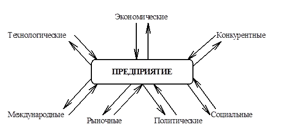 Рисунок 2.1 — Факторы внешней среды 1. Экономические факторы . Существует множество экономических факторов, которые могут воздействовать на предприятие. Например, такие, как насколько доступен кредит, какое влияние оказывают курсы обмена валют, сколько придется заплатить налогов, и многие другие. На способность организации оставаться прибыльной непосредственное влияние оказывает общее здоровье и благополучие экономики, стадии развития экономического цикла. Макроэкономический климат в целом будет определять уровень возможностей достижения организациями своих экономических целей. Плохие экономические условия снизят спрос на товары и услуги предприятия, а более благоприятные — могут обеспечить предпосылки для его роста. При анализе внешней обстановки для некоторой конкретной организации требуется оценить ряд экономических показателей. Сюда включаются ставка процента, курсы обмена валют, темпы экономического роста, уровень инфляции и некоторые другие. Рассмотрим важнейшие из них: а) Ставка процента (уровень процентной ставки) в экономике оказывает значительное влияние на потребительский спрос. Для приобретения товаров потребители часто берут в долг. Менее вероятно, что они будут поступать подобным образом при наличии» высоких ставок процента. В качестве примера можно привести рынок жилья, где процент по закладной прямо влияет на спрос квартир в доме, что, в свою очередь, влияет на количество начатых новых жилищных проектов. И если организация работает в области жилищной индустрии (предоставляет ссуды, выступает в качестве инвестора или строительного подрядчика), то рост процентных ставок будет представлять собой угрозу для реализации планов организации, а их снижение — новые возможности для развития. Организации, рассматривающие планы расширения, которые должны финансироваться за счет получения ссуд, очевидно, будут следить за уровнем ставки процента и ее влиянием на цену капитала. Поэтому ставка процента будет оказывать прямое воздействие на потенциальную привлекательность различных стратегий; б) Курсы обмена валют определяют стоимость рубля по отношению к стоимости денежных единиц других стран. Изменения в курсах обмена валют непосредственно влияют на конкурентоспособность продукции организации, если она экспортирует товары на мировой рынок. Когда стоимость рубля по отношению к другим валютам низка, товары, произведенные в России, относительно недороги, что снижает угрозу со стороны иностранных конкурентов и сокращает импорт. Но если стоимость рубля повышается, то импорт становится относительно недорогим, что, в свою очередь, повышает уровень угроз для организации, создаваемых иностранными конкурентами; в) Темп экономического роста влияет на возможности и угрозы, для организации. Когда происходит рост в экономике, увеличиваются расходы потребителей, что вызывает конкурентное давление на организацию из-за быстрого роста числа предприятий в привлекательной области. Снижение темпов экономического роста и. сокращение потребительских расходов также приводят к росту конкурентного давления, вызванного стремлением предприятий, остаться в отрасли в условиях угрозы кризиса; г) Инфляция. Правительства большинства стран мира прилагают значительные усилия для снижения уровня инфляции. Обычно следс