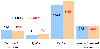 Добыча угля по основным бассейнам в 2006-2007 гг., млн т