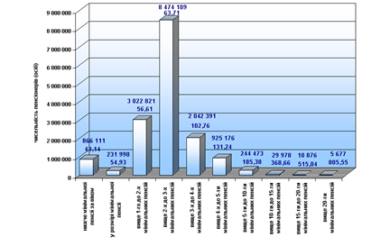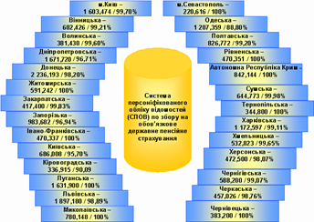 Рис.2.6. Структура розмежування обсягів сплачуємих пенсій пенсіонерам України у 2000 році (кількість пенсіонерів / середній розмір пенсій по групам відносно мінімальної пенсії в 54,93 грн./місяць) [72] У 1999 – 2001 році проведена робота по запровадженню персоніфікованого облік зборів на загальнообов'язкове державне пенсійне страхування в усіх районах і містах України для підготовки пенсійної реформи в Україні (рис.2.7).