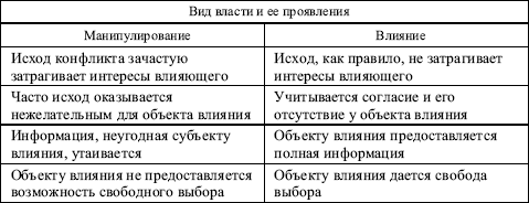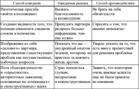 где S1 и S2 – субъекты конфликта; П – посредник Модели поведения партнеров в переговорном процессеУспех переговорного процесса по разрешению конфликтов во многом определяется умением понять своего партнера, правильно оценить его модель поведения и выбрать адекватный стиль общения. В литературе по конфликтологии выделяют четыре основные модели (типа) поведения партнеров в переговорном процессе, которые представлены в табл. 7.1. Таблица 7.1 Модели поведения в переговорах Манипулятивные технологии в переговорном процессе и противодействие имЧасто конструктивное разрешение конфликта зависит не только от навыков эффективного общения или способности субъектов конфликтного взаимодействия овладеть технологиями управления эмоциями в переговорном процессе, но и от применения ими манипулятивных воздействий. Манипуляция – это вид психологического воздействия, искусное исполнение которого ведет к скрытому возбуждению у другого человека намерений, не совпадающих с его актуально существующими желаниями (Доценко, 1997, с. 59). Манипулятивное воздействие на оппонента в общении есть не что иное, как давление. Но в отличие от прямого, открытого давления оно выступает в скрытой форме. Манипулятор действует по принципу: «мягко стелет, да жестко спать». Приведем наиболее часто встречающиеся манипулятивные приемы: • ссылка на авторитет; • выдергивание отдельных фраз из контекста, искажающее смысл; • уход от темы разговора, острых проблем; • намеки; • лесть; • шутки-высмеивания; • предсказание ужасных последствий. Это так называемые простые приемы. Но есть и более сложные, основанные на нарушениях логических законов и правил. К ним можно отнести такие приемы, как: • имитация решения проблемы; • альтернативные формулировки вопросов, требующих ответа «да» или «нет»; • сократовские вопросы (это когда готовятся несколько простых вопросов, на которые оппонент без труда отвечает «да», а затем задается основной вопрос, на который оппонент как бы по инерции тоже дает ответ «да»); • оттягивание решения и др. Особую практическую ценность в противостоянии манипулятивным воздействиям представляют так называемые типичные манипуляции в переговорах и способы противодействия им. Такого рода манипуляции приводятся в табл. 7.2 и 7.3 (Конфликтология, 1999, с. 335–336). Таблица 7.2 Манипуляции, основанные на «правилах приличия» и «справедливости»