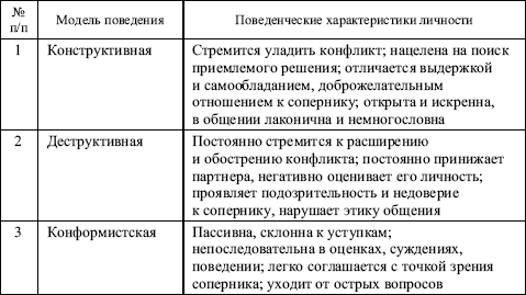 Для определения собственного стиля поведения в конфликте необходимо посчитать сумму ответов (один любой ответ дает один балл) по каждому стилю (столбцу) и построить график своего поведения. Контрольный тест Выберите вариант правильного ответа в каждом из 10 вопросов. 1. Основными моделями поведения личности в конфликте являются: а) конструктивная; рациональная; деструктивная; б) компромисс; борьба; сотрудничество; в) рациональная; иррациональная; конформистская; г) конструктивная; деструктивная; конформистская; д) борьба; уступка; компромисс. 2. Кем из ученых разработана двухмерная модель стратегий поведения личности в конфликте: а) Дж Скотт и М. Дойч; б) Р. Фишером и У. Юли; в) К. Томасом и Р. Килменом; г) Д. Скотт и Ч. Ликсоном; д) Х. Корнелиус и Ш. Фэйр. 3. Сколько стратегий поведения личности в конфликте выделяется в двухмерной модели: а) 1; б) 2; в) 3; г) 4; д) 5. 4. Какое из сочетаний приводимых понятий имеет отношение к стратегиям поведения в конфликте: а) компромисс; критика; борьба; б) уступка; уход; сотрудничество; в) борьба; уход; убеждение; г) сотрудничество; консенсус; уступка; д) соглашение; сотрудничество; убеждение. 5. Какие поведенческие характеристики присущи конструктивной модели поведения в конфликтном взаимодействии: а) стремится уладить конфликт; проявляет выдержку и самообладание; уходит от острых вопросов; б) доброжелательно относится к сопернику; стремится уладить конфликт; ведет себя открыто и искренне; в) стремится к победе в конфликте; отличается выдержкой и самообладанием; непоследователен в оценках, суждениях; г) не проявляет активности; уходит от острых вопросов; отказывается от компромисса; д) стремится уладить конфликт; доброжелательно относится к сопернику; уходит от острых вопросов. 6. Определите тип конфликтной личности по следующим поведенческим характеристикам: хочет быть в центре внимания; хорошо приспосабливается к различным ситуациям; планирование своей деятельности осуществляет ситуативно; кропотливой, систематической работы избегает. а) ригидный тип; б) неуправляемый тип; в) демонстративный тип; г) сверхточный тип; д) «бесконфликтный тип». 7. Какие поведенческие характеристики присущи конфликтной личности ригидного типа: а) хочет быть в центре внимания; хорошо приспосабливается к различным ситуациям; планирование осуществляет стихийно; б) скрупулезно относится к работе; предъявляет повышенные требования к себе и другим людям; подозрителен; в) ведет себя вызывающе, агрессивно; подозрителен; хорошо приспосабливается к различным ситуациям; г) обладает завышенной самооценкой; подозрителен; прямолинеен и негибок; д) отношение к людям определяет тем, как они к нему относятся; обладает завышенной самооценкой; несамокритичен. 8. Какое сочетание поведенческих характеристик присуще конфликтной личности «бесконфликтного типа»: а) хочет быть в центре внимания; избегает кропотливой работы; налицо эмоциональное поведение; б) подозрителен; обладает завышенной самооценкой; прямолинеен; обидчив; в) импульсивен; непредсказуем; агрессивен; несамокритичен; г) скрупулезно относится к работе; предъявляет повышенные требования к себе и окружающим; обладает повышенной тревожностью; д) неустойчив в оценках и мнениях; внутренне противоречив; зависит от мнения окружающих; легко поддается внушению. 9. Какое сочетание поведенчес