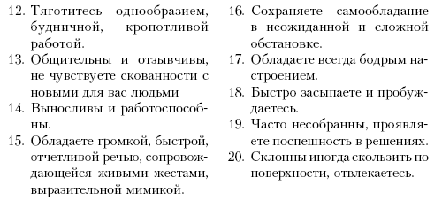 где Фт – формула темперамента (интегральный темперамент); А – общее число плюсов по всем типам темперамента; Ax – общее число плюсов в «паспорте» холерика; Ac – общее число плюсов в «паспорте» сангвиника; Аф – общее число плюсов в «паспорте» флегматика; Ам – общее число плюсов в «паспорте» меланхолика. Оценка результатов Если доля какого-либо темперамента в результате составляет 40 % и выше, то данный тип темперамента является у вас доминирующим. Если этот результат составляет 30–39 %, то качества данного типа выражены достаточно ярко. Тест 9.2. Самооценка агрессивности Инструкция. Выберите в каждом вопросе один из вариантов ответа. Если на какой-либо вопрос не сможете найти ответа, то при подсчете набранных баллов оцените его в 2 очка. 1. Склонны ли вы искать пути к примирению после конфликта? а) всегда; б) иногда; в) никогда. 2. Как вы ведете себя в критической ситуации? а) внутренне кипите; б) сохраняете полное спокойствие; в) теряете самообладание. 3. Каким считают вас коллеги? а) самоуверенным; б) дружелюбным; в) спокойным. 4. Как вы отреагируете, если вам предложат ответственную должность, на которой можно «погореть»? а) примете ее с некоторыми опасениями; б) согласитесь без колебаний; в) откажетесь от нее ради собственного спокойствия. 5. Как вы будете себя вести, если кто-то из ваших коллег без разрешения возьмет бумагу с вашего стола? а) выдадите ему «по первое число»; б) попросите вернуть; в) проигнорируете. 6. Какими словами вы встретите жену, если она вернулась с работы позже обычного? а) «Что это тебя так задержало?»; б) «Где ты торчишь допоздна?»; в) «Я уже начал волноваться». (Женщинам – тот же вопрос про мужа. Холостым – как встретите опоздавшего на встречу.) 7. Как вы ведете себя за рулем автомобиля (своего или будучи с ребенком на автодроме)? а) стараетесь обогнать машину, показавшую вам «хвост»; б) вам все равно, сколько автомобилей вас обошло; в) помчитесь с такой скоростью, чтобы никто не догнал вас (на автодроме будете «таранить»). 8. Какими вы считаете свои взгляды на жизнь? а) уравновешенными; б) легко меняющимися; в) твердыми. 9. Что вы предпринимаете, если не все удается? а) находите виновного (из числа окружающих); б) смиряетесь; в) становитесь впредь осторожнее. 10. Как вы отреагируете на информацию о распущенности современной молодежи? а) «Ловить и отправлять в колонию!»; б) «Пуританство, видно, сегодня не в моде»; в) «Надо ввести полицию нравов и штрафовать как следует!». 11. Что вы ощущаете, если должность, которую вы хотели занять, досталась другому? а) «И зачем я только на это нервы тратил?»; б) «Видно, его физиономия шефу приятнее!»; в) «Может быть, мне это удастся в другой раз». 12. Как вы смотрите страшный фильм? а) боитесь; б) скучаете; в) получаете истинное удовольствие. 13. Как вы относитесь к состязанию, игре? а) стараетесь победить; б) по-олимпийски: главное не победа, а участие; в) расстраиваетесь очень сильно, если проигрываете. 14. Если из-за дорожной пробки вы опоздали на важное совещание: а) будете нервничать во время заседания; б) попытаетесь оправдаться; в) огорчитесь. 15. Как вы поступите, если вас плохо обслужили в ресторане, кафе? а) стерпите, избегая скандала; б) вызовете администратора; в) отправитесь с жалобой к директору ресторана (кафе). 16. Как вы себя поведете, если вашего ребенка (младшего брата, сестру) обидят в школе? а) поговорите с учителем;