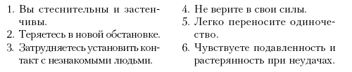 Лица с нереалистично завышенным уровнем притязаний, переоценивая свои способности и возможности, берутся за непосильные для них задачи и часто терпят неудачи. Люди с высоким, но реалистичным уровнем притязаний стремятся постоянно к улучшению своих достижений, к самосовершенствованию, к решению все более и более сложных задач, к достижению трудных целей. Лица с умеренным уровнем притязаний стабильно и успешно решают круг задач средней сложности, не стремясь улучшить свои достижения и способности и перейти к более трудным целям. Лица с низким или нереалистично заниженным уровнем притязаний выбирают слишком легкие и простые цели, что может объясняться: а) заниженной самооценкой, неверием в свои силы, «комплексом неполноценности», либо б) «социальной хитростью», когда, наряду с высокой самооценкой и самоуважением, человек избегает социальной активности и трудных, ответственных дел и целей. Примечание для экспериментатора: 1) размеры таблиц 10 х 3 см, размеры маленьких квадратиков в таблицах 1 х 1 см; 2) длительность 1-го, 2-го, 4-го опытов 10 секунд, а в 3-м опыте – 8 секунд для искусственного создания ситуации неудачи. Тест 8.4. Самооценка комплекса неполноценности Первыми комплексы неполноценности описали и дали им определение «отцы-основатели» психоанализа. Этим названием они обозначили эмоционально окрашенные убеждения и жизненные принципы, проявляющиеся в импульсивных, не поддающихся объяснению поступках, осложняющих нормальную жизнь, ограничивающих возможности развития личности и мешающих испытывать чувство радости. Комплекс неполноценности заставляет человека ощущать себя ниже других, он, например, может стать причиной отказа от любой конкурентной борьбы: экзамены, профессиональные конкурсы, бизнес и т. д. Этот комплекс порожден неуверенностью в своих достоинствах или способностях. «Не буду даже пробовать, все равно проиграю!» – убеждают себя жертвы этого комплекса. Комплексы развиваются, как правило, у людей, которые по природе своей или по воспитанию склонны быть суровыми судьями. Они выносят себе суровый приговор («за малый рост», «толстые ноги» и т. д.), но также постоянно осуждают и других. С точки зрения психологии, та или иная самооценка самым прямым образом связана с вашим отношением к окружающему миру. Тот, кто любит этот мир, любит и себя. А значит, если мы всегда критикуем других, то мы будем безжалостны и к себе. Безжалостность войдет в привычку, а затем станет комплексом. Такой человек практически не бывает доволен собой. Каждого что-то грызет, у каждого свои комплексы. Мы все время сравниваем себя с кем-то, чтобы убедиться, что и мы чего-то стоим. А как обстоит дело с вами? Для этого ответьте на вопросы теста. Инструкция. Прочтите каждое утверждение, выберите тот вариант ответа, который наиболее справедлив для вас, выпишите номер утверждения и количество очков на выбранный вариант ответа (количество очков указано рядом с вариантом ответа). 1. Люди меня не понимают а) часто (0) б) редко (3) в) такого не бывает (5) 2. Чувствую себя «не в своей тарелке» а) редко (5) б) все зависит от ситуации (3) в) очень часто (0) 3. Я оптимист а) да (5) б) только в исключительных случаях (3) в) нет (0) 4. Радоваться чему попало, это а) глупость (0) б) помогает пережить трудные минуты (3) в) то, чему стоит поучиться (5) 5. Я хотел бы иметь такие же способности, как дру